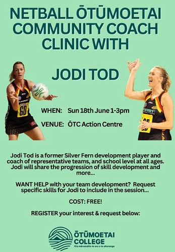 Ōtūmoetai Community Coach Clinic with Jodi Tod at Ōtūmoetai College. See the attached brochure for more information and email lrichardson@otc.school.nz to register.