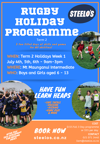 Attached is information about an up-coming Holiday Programme. You can book your spot here: Book your spot (steelos.co.nz)