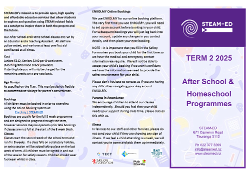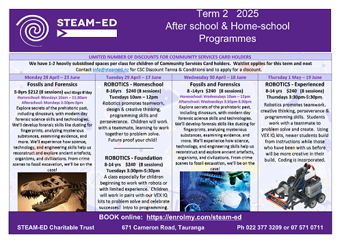 See the attached flyer for our upcoming afterschool classes in Term 2. The topic is Fossils and Forensics so tamariki will be learning how to use scientific and technology tools to gather and evaluate evidence to solve crimes and understand mysteries of the ancient past.