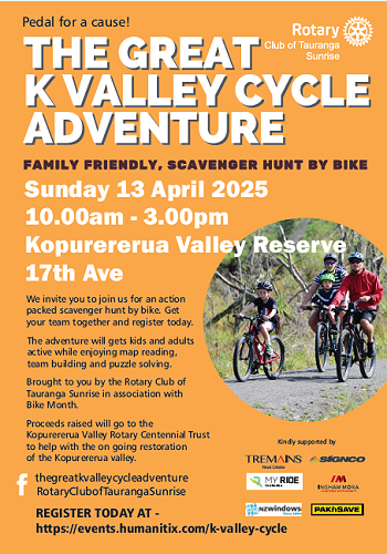 Get the kids out and active during the April holidays in support of restoring K Valley to its natural state. Join our family-friendly scavenger hunt by bike in the Kopurererua Valley on Sunday 13th April. Meet at the bottom of 17th Avenue from 10:00 am (rolling start until 12:00 noon). Prizes (including a bike) will be awarded at 2:30 pm. Go to https://events.humanitix.com/k-valley-cycle to sign up a team of up to six for just $40 (Organised by Tauranga Sunrise Rotary). See the attached flyer for further details.
