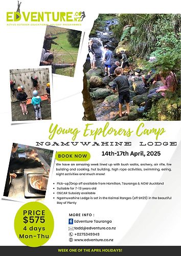 Based at Ngamuwahine Lodge (SH29, Tauranga), this affordable 4 day camp is for children aged 7-13 looking for a mix of our usual fun outdoors activities including, archery, target shooting, bush walks, swimming, hut building, camp fires and much more. See the attached flyer and book at: www.edventure.co.nz