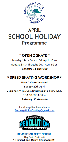 Tauranga Roller Skating Club is a well established club and growing rapidly now that we are based at our new purpose built rink at REVOLUTION SKATE CENTRE at Baypark, Mount Maunganui. Please see attached an introduction to Learn to skate programs with the opportunity for students to continue on to recreational or competitive skating. See the attached flyer for further details.