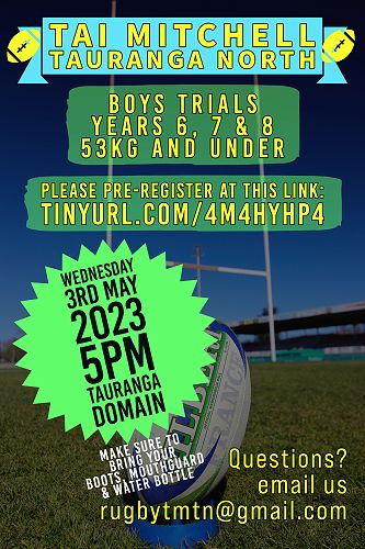 Calling all Year 6, Year 7 and Year 8 boys 53 kg and under to trial on Wednesday 3rd May 2023 for the upcoming Tai Mitchell tournament.