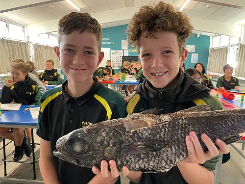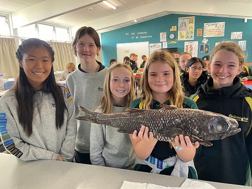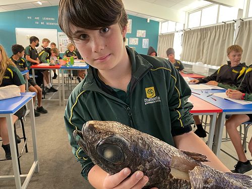 Due to the generosity of Professor Chris Battershill, Coastal Science, Waitkato University – the Year 8 Rutherford Science students had a fishy Friday morning with a Ribaldo, aka Googly-eyed cod. Chris said this specimen was caught at around 1000m off Whaakari/White Island.