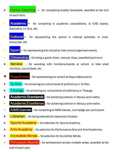 As you may all be aware, the school acknowledges students' successes by awarding badges at assembly and the criteria is published on our school website. The school has awards to recognise students' achievement. The awards presented are attached.