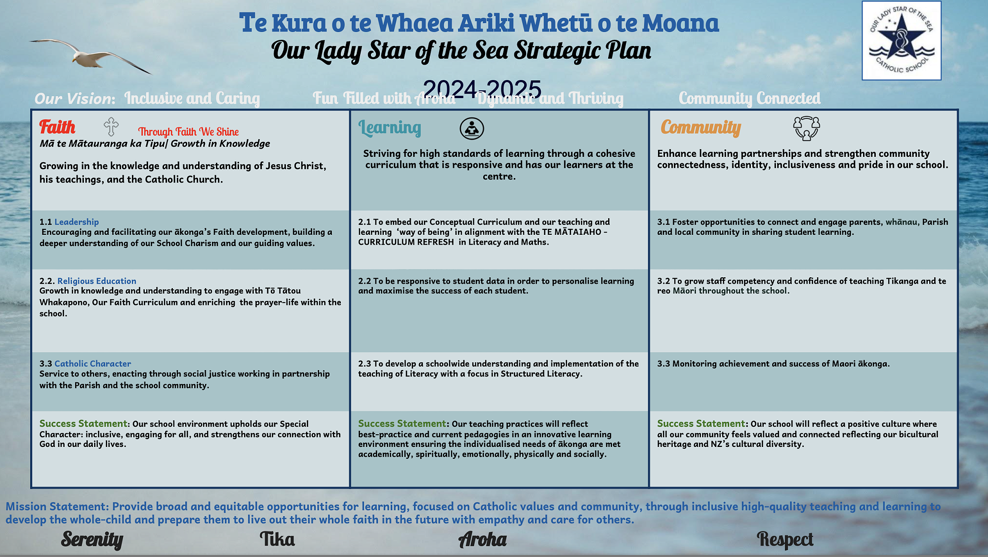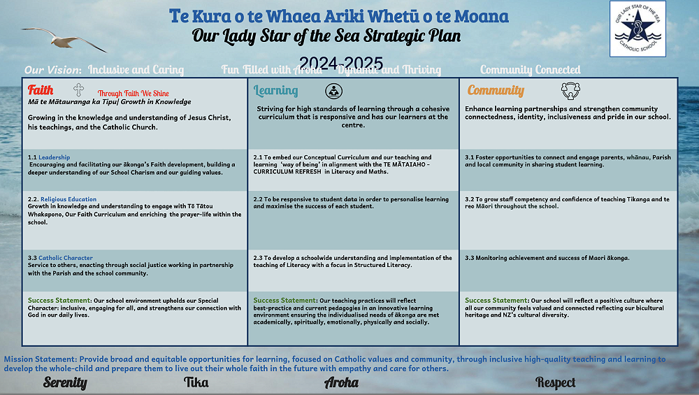 I would like to share with our parent community our new Strategic Plan for 2024 and 2025 which aligns with our School Vision, School Values and Mission Statement. Details of our strategic initiatives, annual goals and intended actions to achieve and make progress are in our Implementation Plan on our website. It would be a pleasure to talk to you about our Strategic Plan goals: Faith, Learning and Community in more detail should you wish to explore areas of focus and prioritisation based on the needs of our learners and Ministry of Education expectations. Pop into my office and see me.