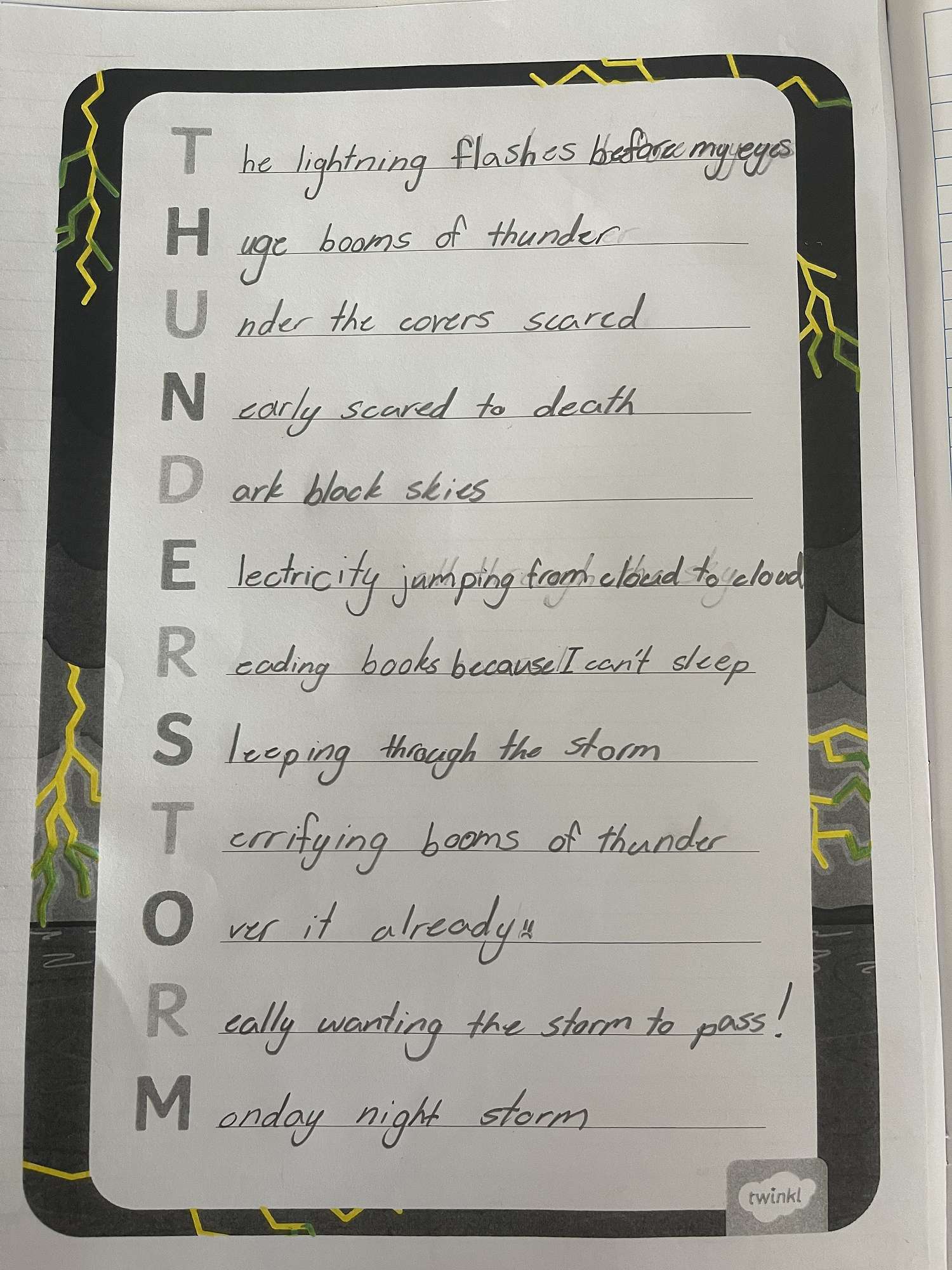 The WILD weather on Monday night was the hot topic on Tuesday morning... this lead to a class brainstorm and some poetry about Thunderstorms. We used Acrostic poem structure to share our ideas on this.