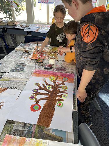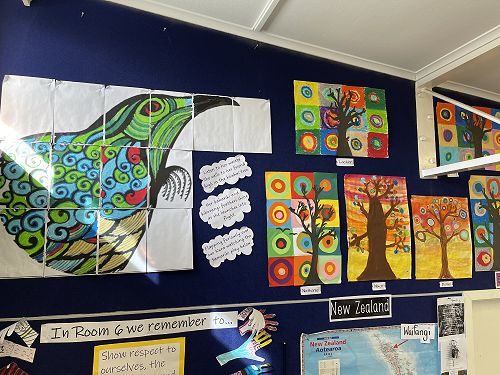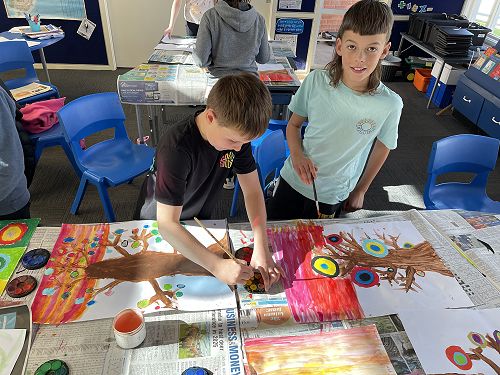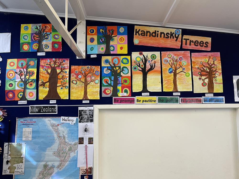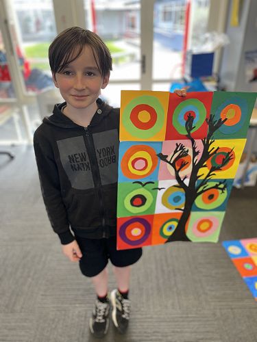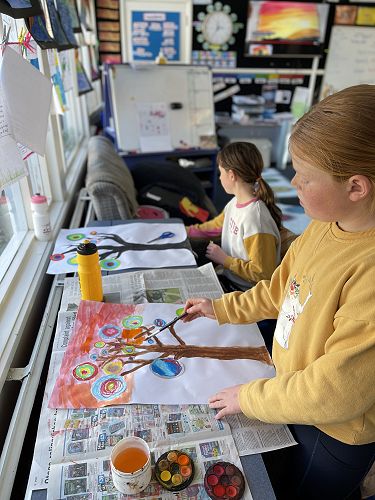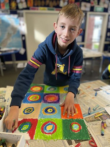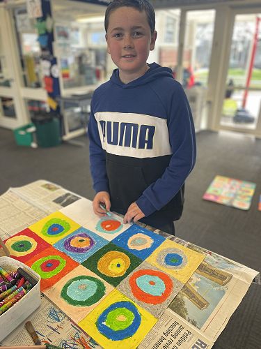 With illness hitting Room 6 hard we battled on. Small numbers meant we adapted our programme to suit. We decided to look at the Russian artist Wassily Kandinsky and how he used circles in his artwork. Then we used his methods to create our own masterpieces. We included the Outram sunsets as our backdrop.