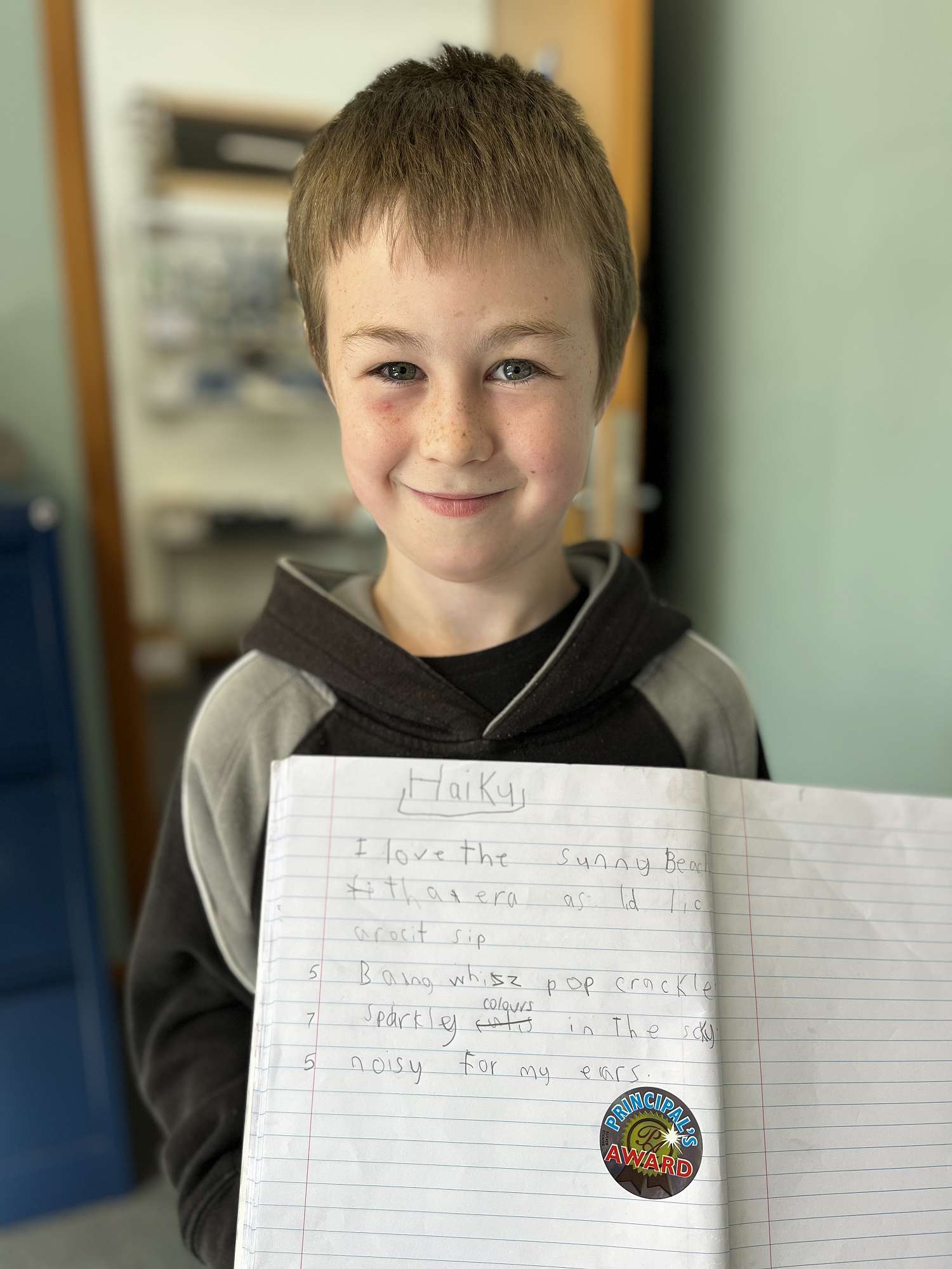 Room 10 have been writing some poetry. Oakley wrote this great haiku poem about Fireworks and the noises they make. I could really hear all those fireworks noises as you read me your poem Oakley.