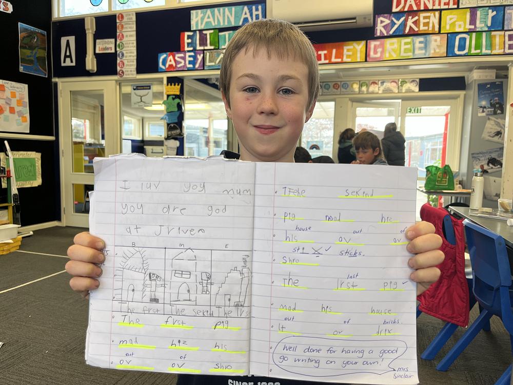 Oakley is learning to write a story with a beginning, middle and an end. He has sequenced the retelling of 'The Three Little Pigs' written independently using his letter to sound relationships. Great to see you so proud of your writing Oakley!