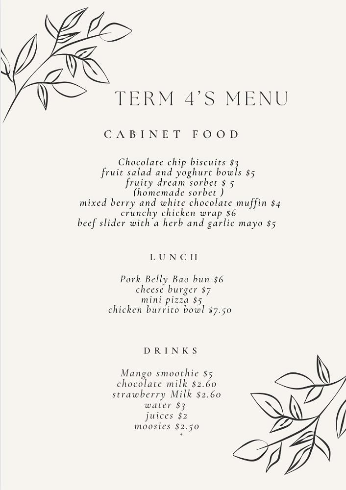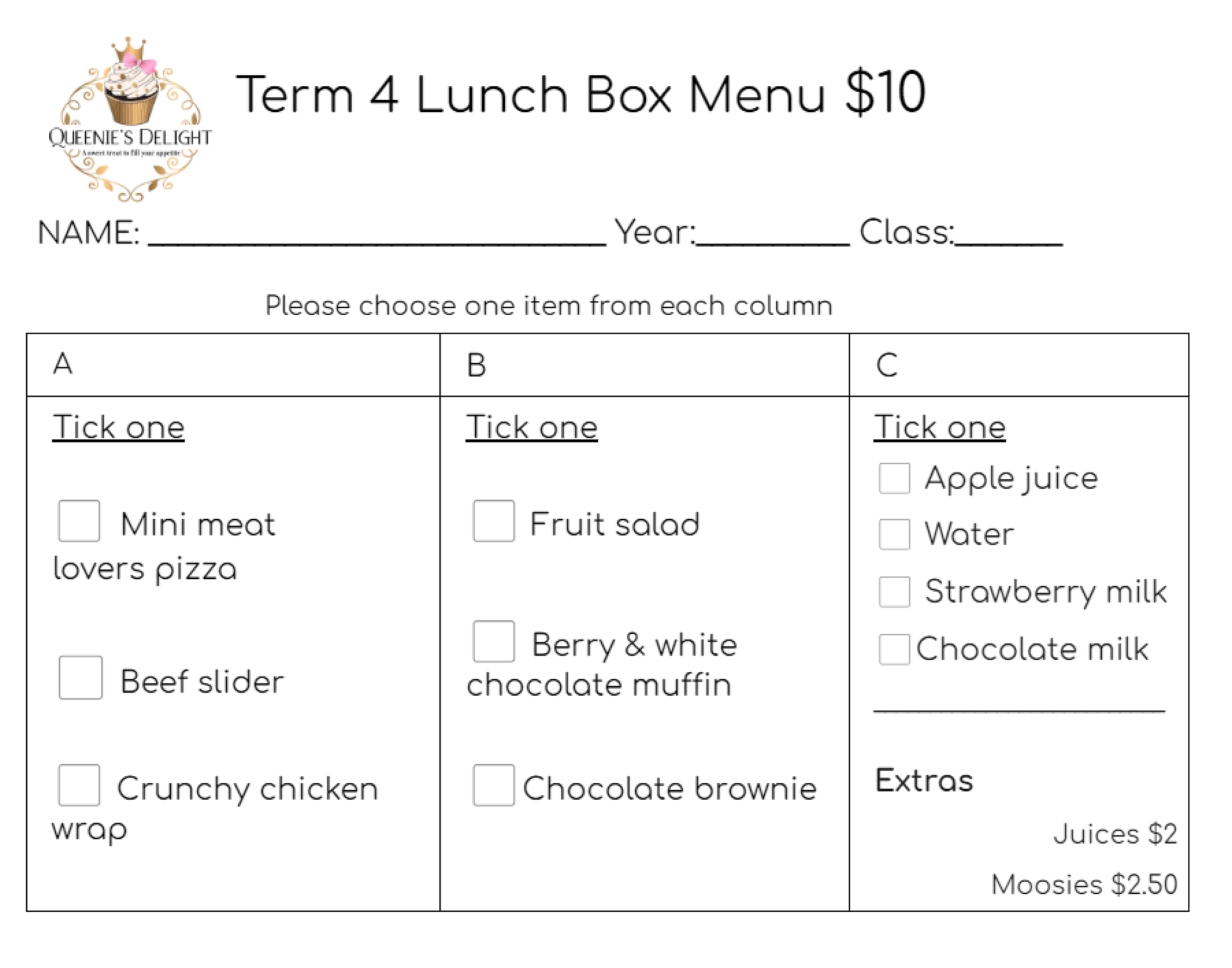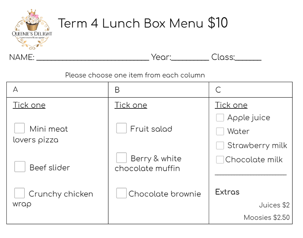 Term 4 Canteen menu Canteen — October 12th, 2023 To order Queeniesdelight@outlook.com and 0274735607, or drop forms to reception