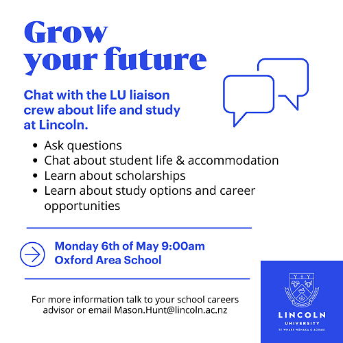 Monday May 6th Mason from Lincoln Uni will be here to speak with Year 13 and interested Year 12s during LM time, 9 am-10 am in Tūrama. See the info sheet below for more information regarding this.