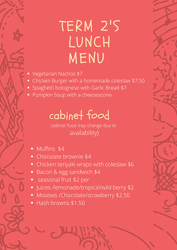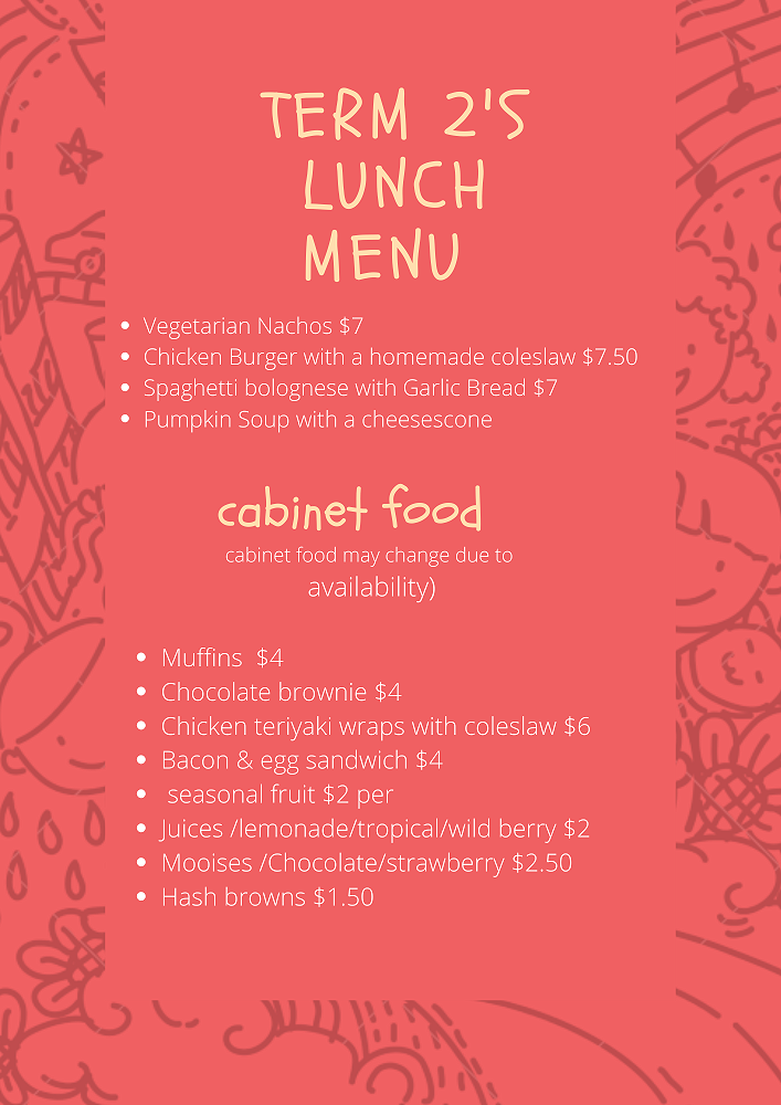 Cabinet food will be available from Break 1 (Year 7-13 only) and the lunch menu will be available from Break 2.