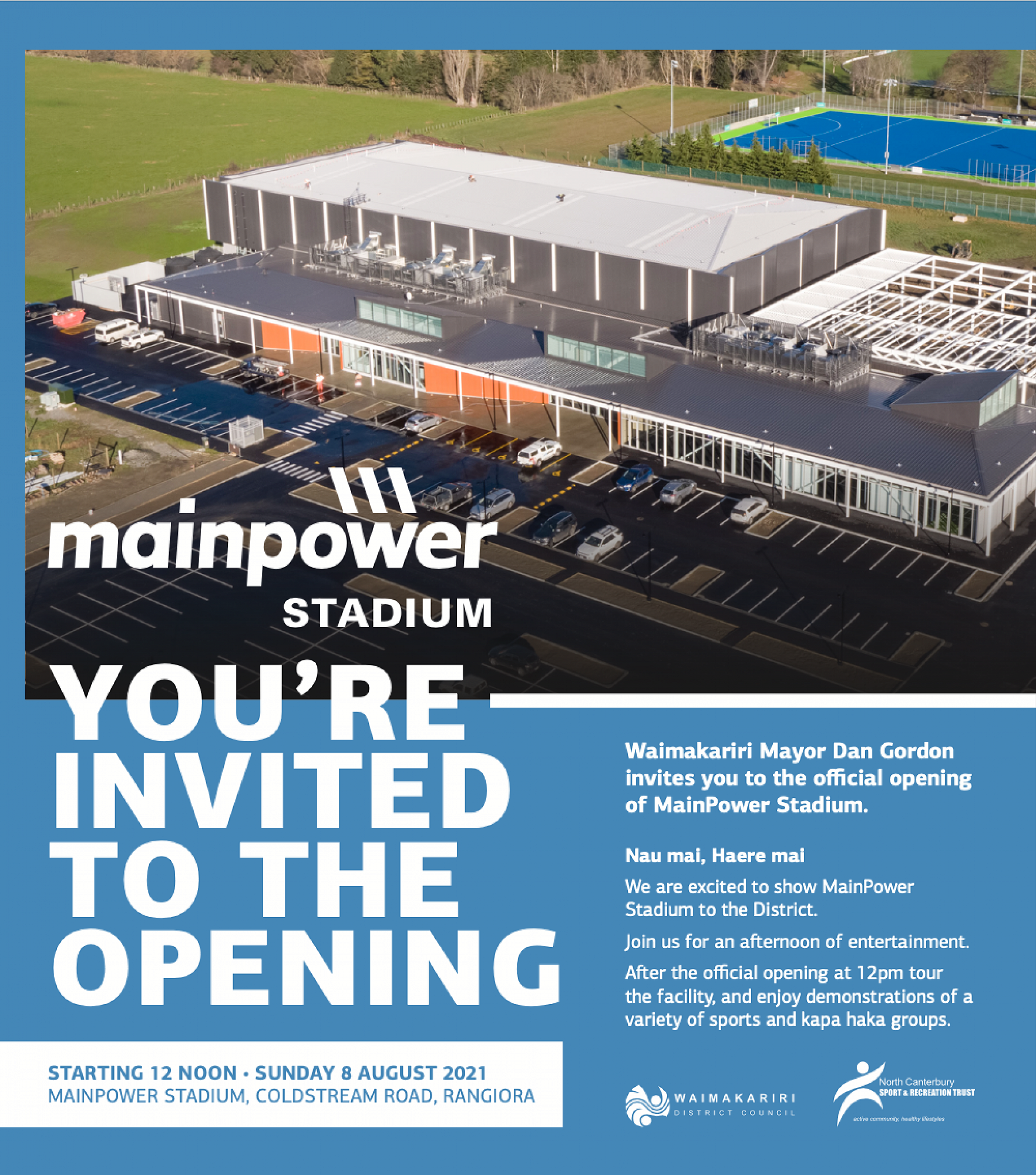 North Canterbury's biggest and best sporting facility, MAINPOWER STADIUM, is set to open its doors to the community on the 8th of August! Come on down to Coldstream Road, from 12noon to see Mayor Dan Gordon cut the official ribbon on the FOUR full size multi-use sports courts, Stadium Fitness Centre with demonstrations on the new group training programmes PRAMA and Revl GT, ALLIED HEALTH HUB, Sports House administration offices, conference rooms, coffee, juice and food hub and much more! The team from MoreFM will be onsite with loads of giveaways. With hundreds of car parks on site, there is plenty of room for everyone! MainPower Stadium is open 12 – 4.30pm on Sunday August 8, at 289 Coldstream Road, Rangiora. Go to mainpowerstadium.nz for more information.