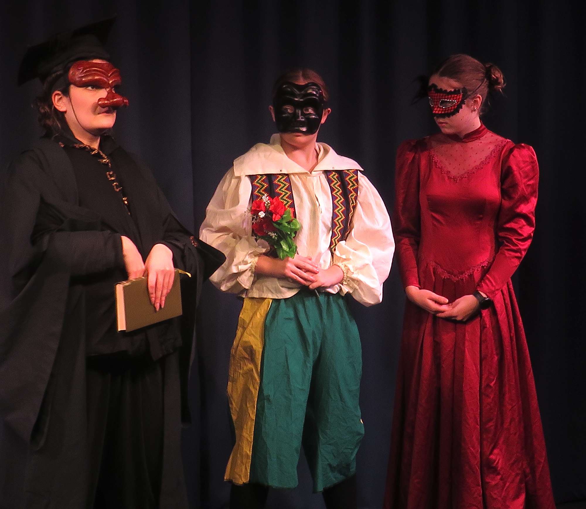 The students are studying this historical genre for their exams as well as performing in several short plays, typical of this theatre form. The characters in Commedia are stock characters who represent fixed social types such as foolish old men, devious servants, talented women, or military officers full of false bravado.