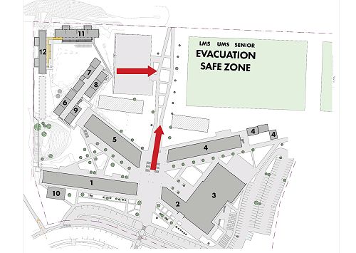 - When you hear the alarm or the evacuation notification on the speaker system, follow the instructions and make your way to the evacuation assembly point (Safe Zone-see below).
