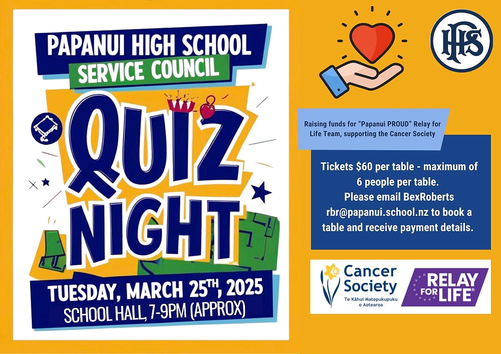 If you wish to enter a table, please email Bex Roberts - rbr@papanui.school.nz to book and sort payment OR if there are spare tables, come along with $10 and form a team on the night! This is an all-ages event.