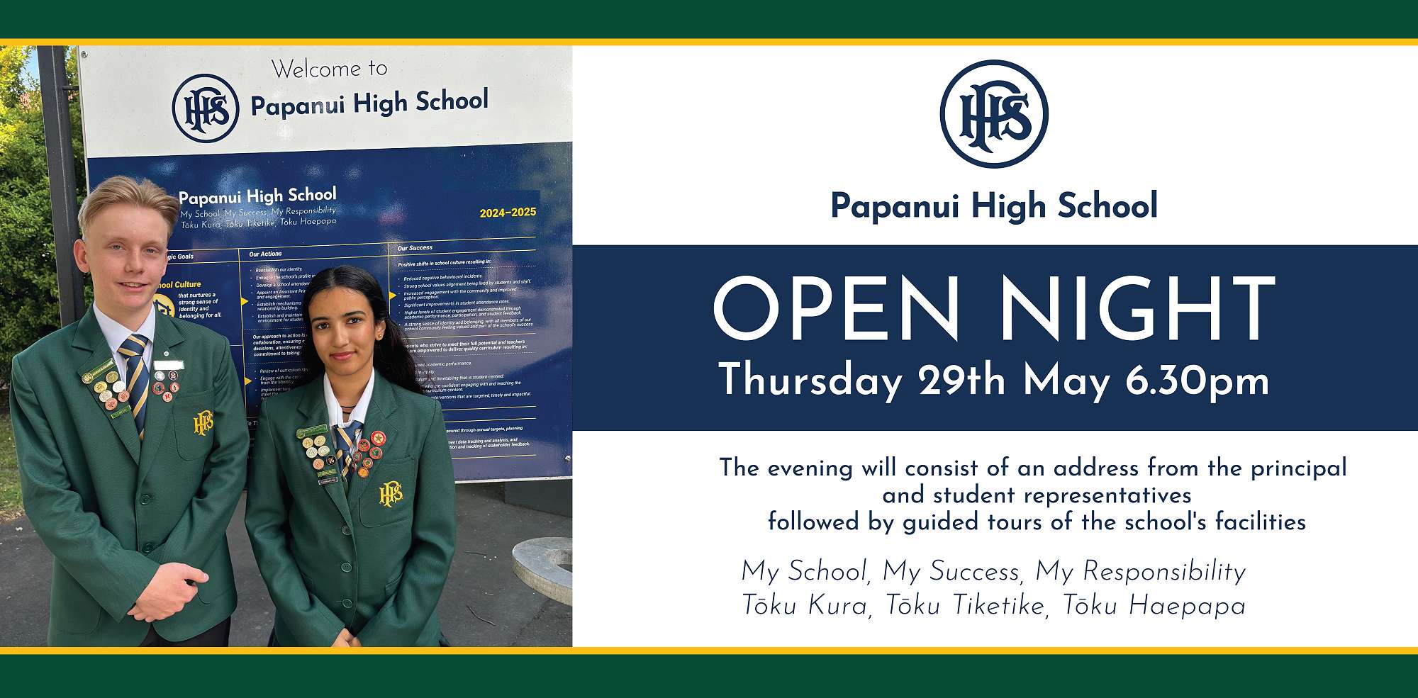 Nau mai, Haere mai. Prospective students and their whānau are warmly invited to attend Papanui High School’s Open Night on Thursday 29th May, starting at 6.30pm in the School Hall.