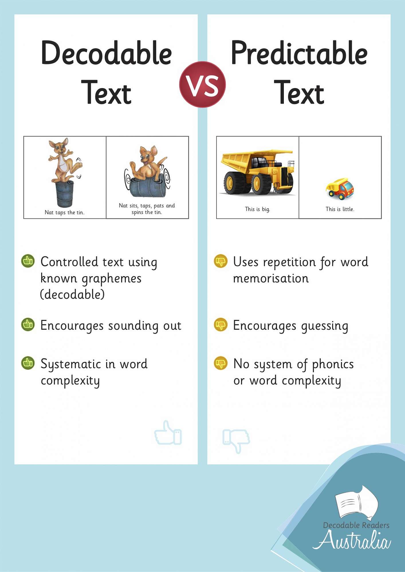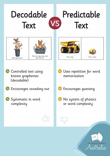 Levelled readers have a large focus on comprehension and moving children up the levels quickly. Word selection can be random, bringing in words with sounds that children have never been exposed to and so they often can't decode (sound them out) them. Teachers or parents may prompt the reader to work out what the word is using the first sound and rely heavily on the pictures for clues. This can lead to a lot of guessing and not always reading the words accurately.