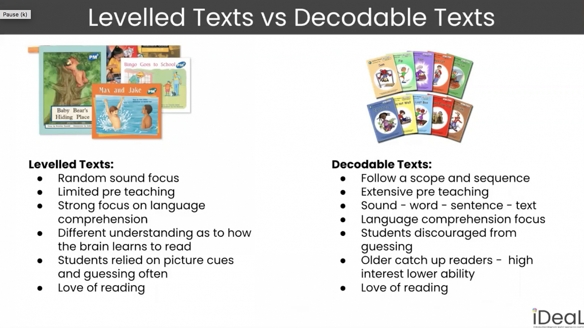 This diagram from iDeal helps to give a comparison between the traditional levelled readers that we were using (the colour wheel) and decodable texts and a structured approach to teaching reading.