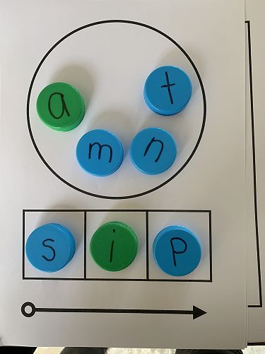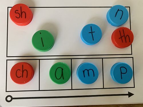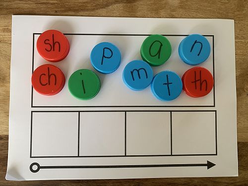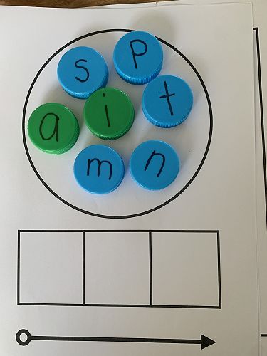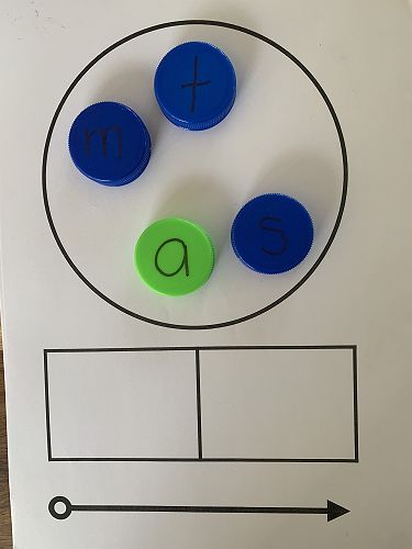 As your child progresses you can move to 3 sounds - CVC words (consonant, vowel, consonant). If you are using bottle tops, try to use different colours for the vowels to help support your child.