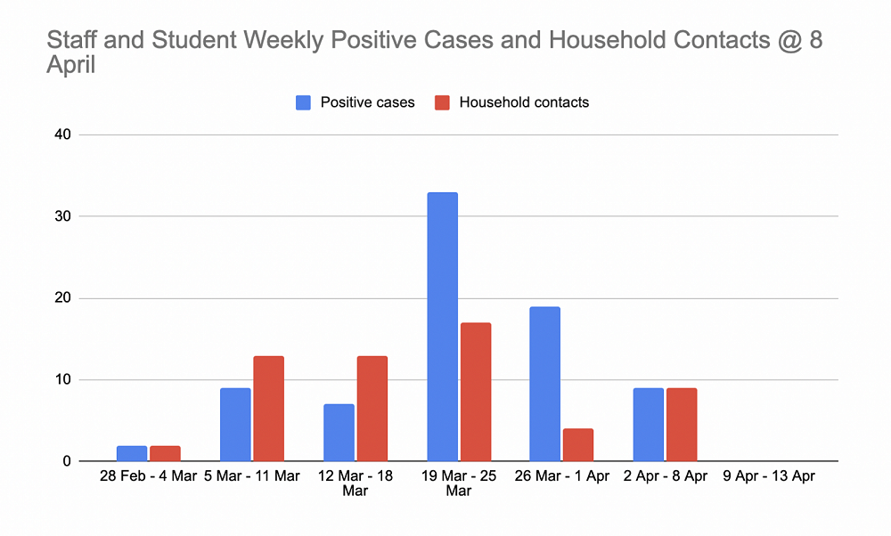 The weekly trend graph has been updated and for the first time it shows the number of children and staff who were Household Contacts. Of the 58 Household Contacts who were isolating at home 20 (34%) caught Covid and became Positive Cases.