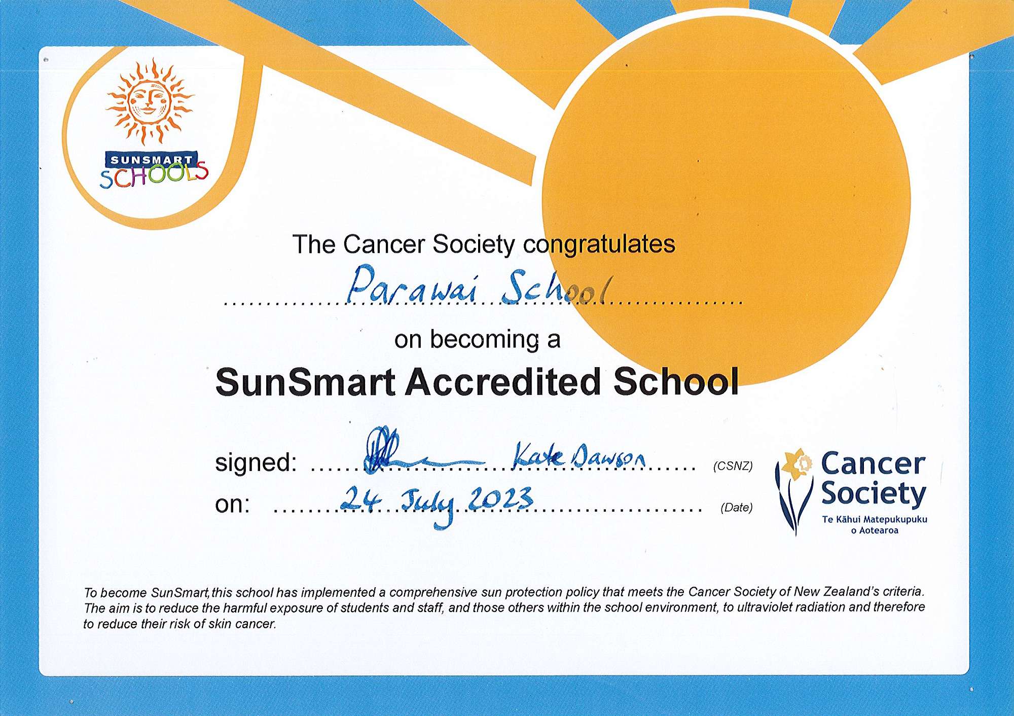 2. SunSmart School: Pārāwai School has again been accredited as a SunSmart school for a further three years from 22nd August 2019 to August 2022. To become SunSmart we have implemented a comprehensive sun protection policy that meets the Cancer Society of New Zealand's criteria. The aim is to reduce the harmful exposure of students and staff, and those others within the school environment, to ultraviolet radiation and therefore to reduce thei risk of skin cancer.