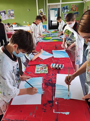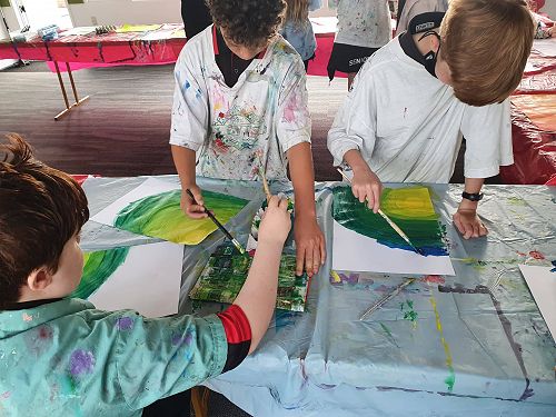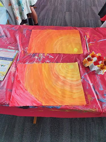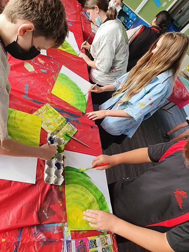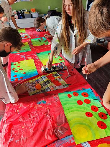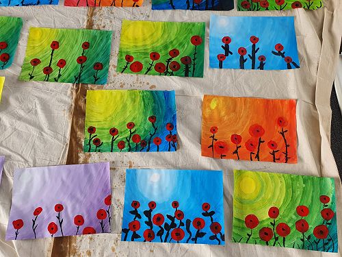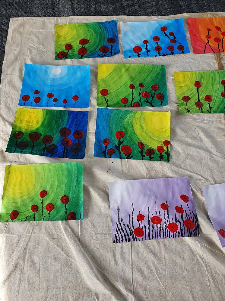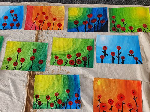 Using poppies as the focus, we learnt how to blend paint to create a colour gradient for a landscape. The poppies that we created using water balloons really stood out against the background!