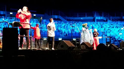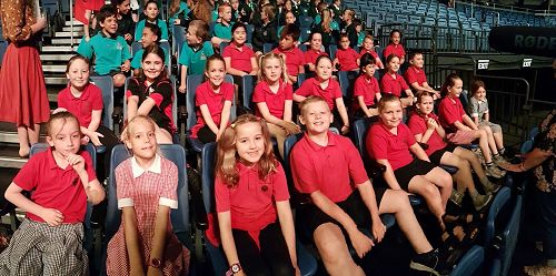 Ayla and Leesha tried out for a soloist position in the show. We were so proud of how brave they were to give this a go. They missed out this time but they got to sit right behind the main performing area and were invited onto the stage to sing and dance along to the last song. They even got to sing into Jackie's microphone!All of the choir had to meet Mrs Newton and Mrs Luhetoa at the Arena at 6:45. We donated cans to the Salvation Army Food Bank as we walked in.