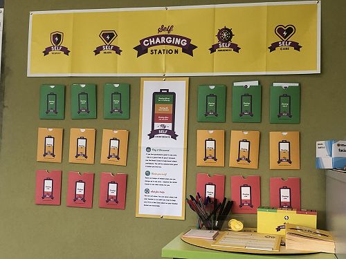 We have a self charging station so every morning we have to find our names and put it in a little box with feelings that are green, yellow is ok and red is low.