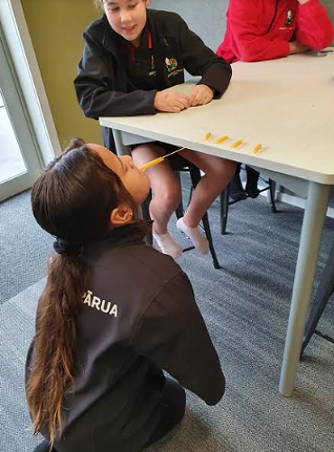 Once each competitor is selected, about five contestants stand at the front of the class, eager to earn points for their team. Some challenges involve things such as picking up a pretzel on the end of a skewer using ones mouth, or stacking Froot Loops, or getting an oreo from your forehead to your mouth without using your hands. Each task has a one minute time limit and a set amount of points for a place.