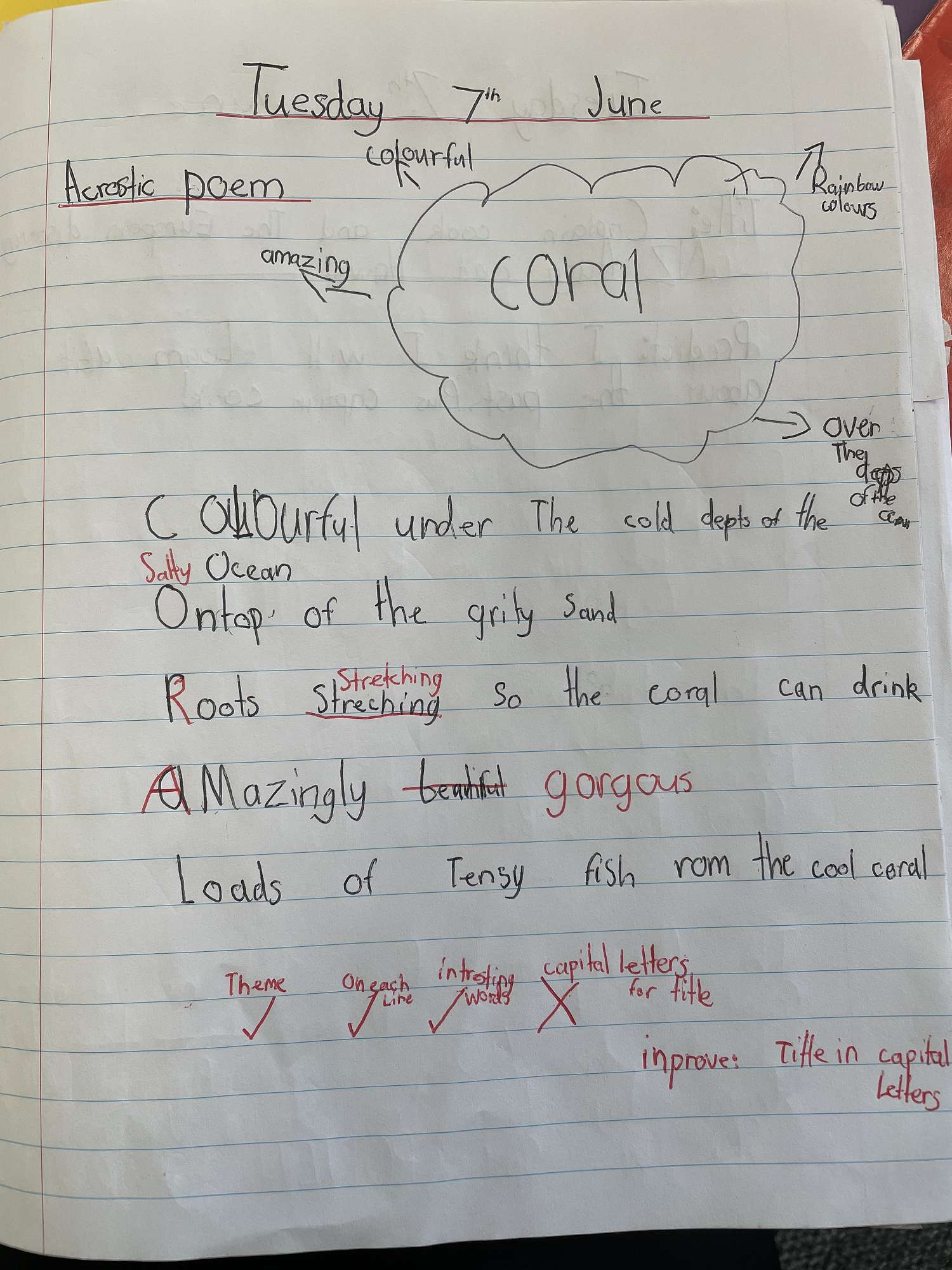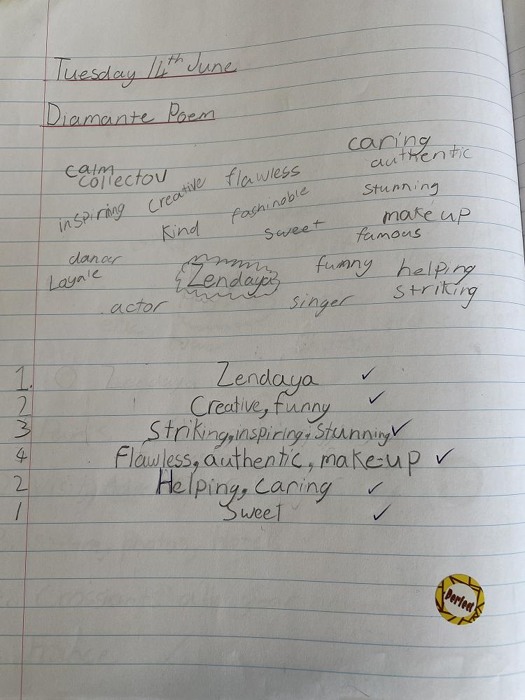 We have been learning all about the different types of poetry and what makes them unique. So far we have covered these poems; Acrostic which means you use the first letter of each phrase to spell out a word.