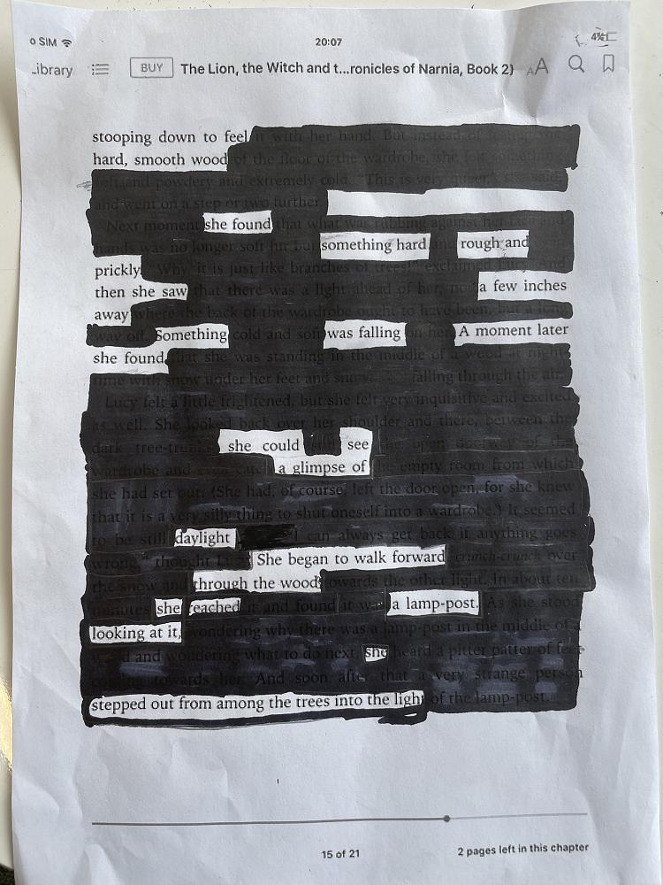 Lastly, blackout poems. We took some famous pieces of writing and created a poem using the most interesting word from the text and blacked out the rest.