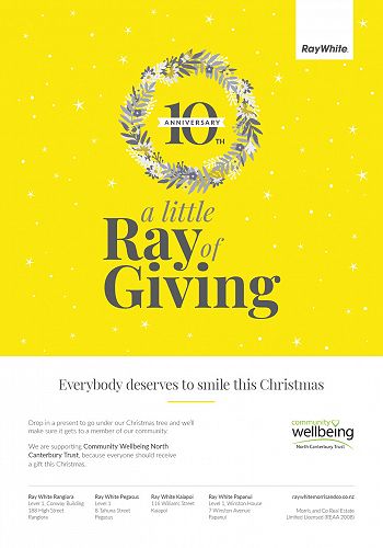 Ray White Pegasus are proud to partner with Community Wellbeing North Canterbury Trust for the 10th Anniversary of our Little Ray of Giving campaign this Christmas
