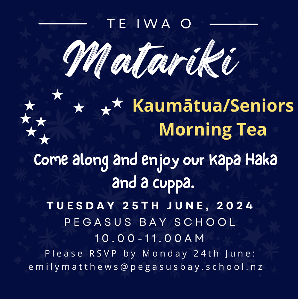 Our kura Kaumātua Morning Tea is being held on Tuesday 25th June. Tamariki who are in kapa haka are encouraged to invite a grandparent or other special older person to attend. Please see the invite below and send RSVPs with numbers to emilymatthews@pegasusbay.school.nz