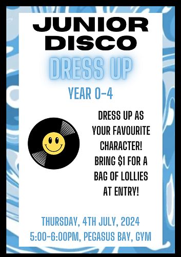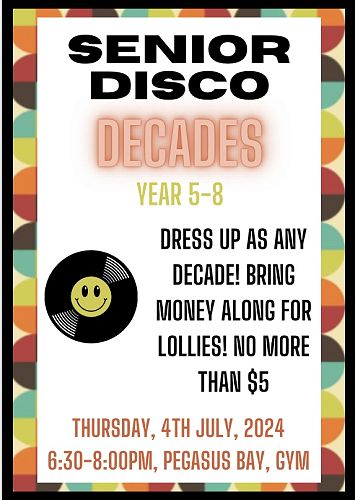 Last year we requested that parents send no more than $5 with their child for lollies, and some children arrived with considerably more money than that. We'd appreciate it if you could make sure that if your senior disco child is bringing money, they have no more than $5 with them.