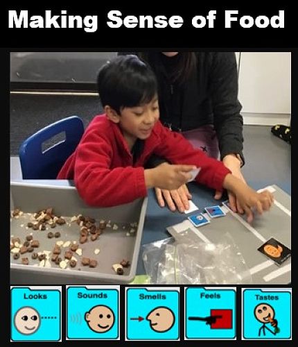 There is a range of related experiences you can try at home too. Try listening to this Cocomelon, 5 Senses song and print out the attached mini communication books, or vocabulary pathways guides for Proloquo2Go or PODD systems. There is a high contrast (black background) mini book to use if your young person has visual difficulties. We have attached the "Introducing new foods" quick guide as a reference.