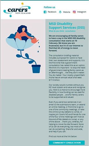 We are encouraging all family carers to have a say in the MSD DSS disability consultation that starts on 10 February. We know you are frustrated, but it's in our interest to find that bit of energy to move forward.