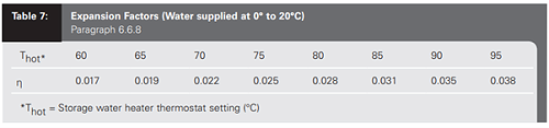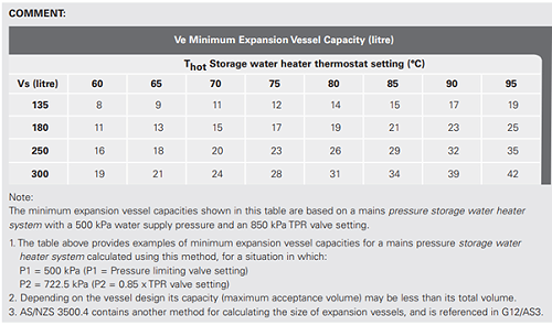 The attached picture Table 7: Expansion Factors shows common sizes of hot water cylinders and the thermostat setting is also provided to assist in the selection of the correct sized expansion vessel.