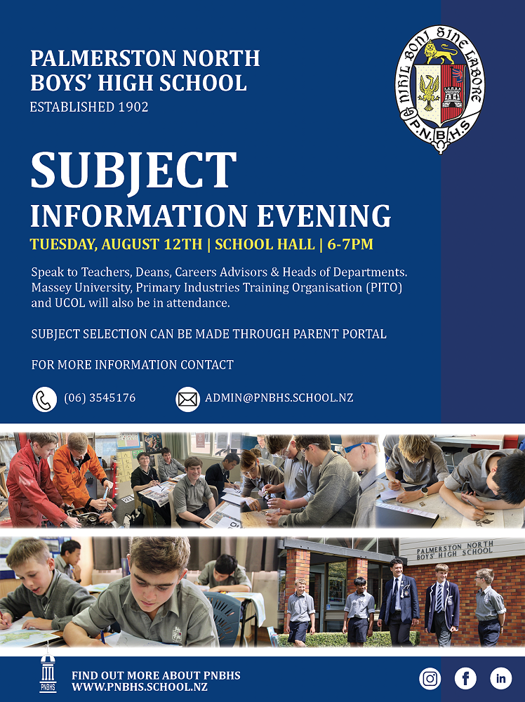 At our Subject Information Evening (6.00pm - 7.00pm on Tuesday, August 12), you can speak to Teachers, Deans, Careers Advisors & Heads of Departments. Liaison staff from Massey University, UCOL and PITO (Primary Industries Training Organisation) will also be in attendance.