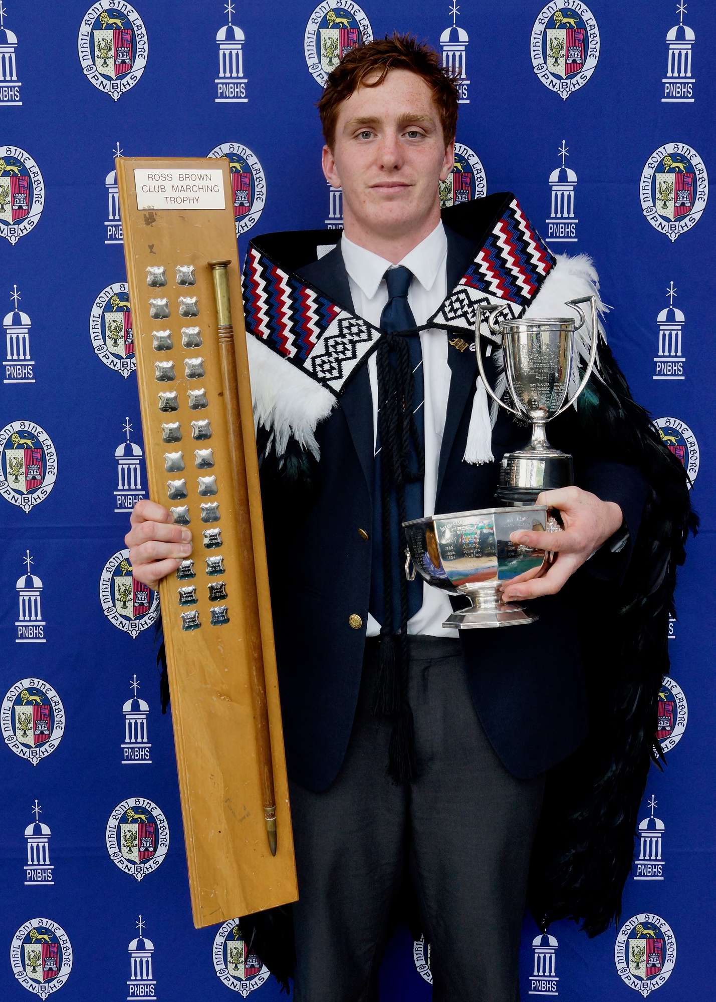 Murray - Club Captain Elyjah Crosswell with the Waldegrave Cup for Rugby, the Monrad Cup for Physical Education and the Ross Brown Baton for Marching — Image by: PNBHS