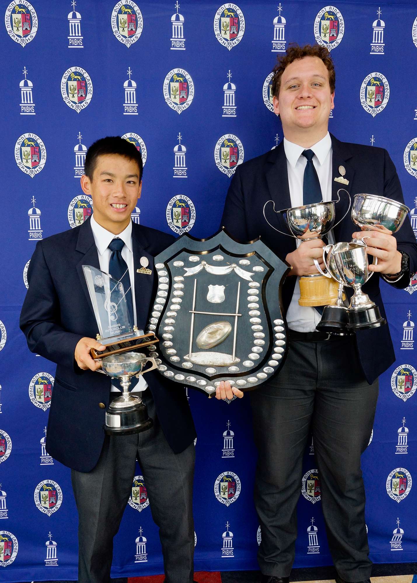 Kia Ora – Club Captain William Leong & Deputy Club Captain Ryan Cutler: Cutler Cup – Football, Denis Duffy Trophy – Table Tennis, Louisson Cup – Athletics, Mummery Cup – Hockey, Young Trophy – Choral, Fountain/Love Cup – Club Captain’s Award, Shand Shield — Image by: PNBHS