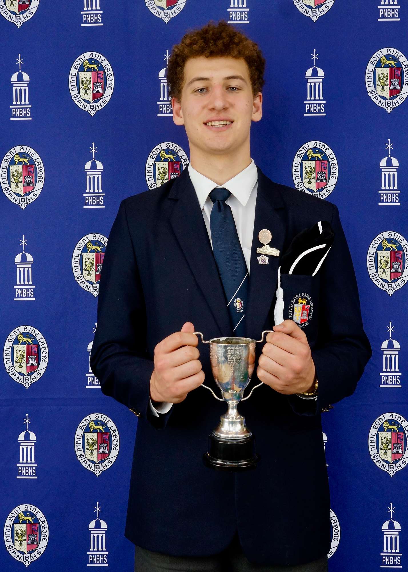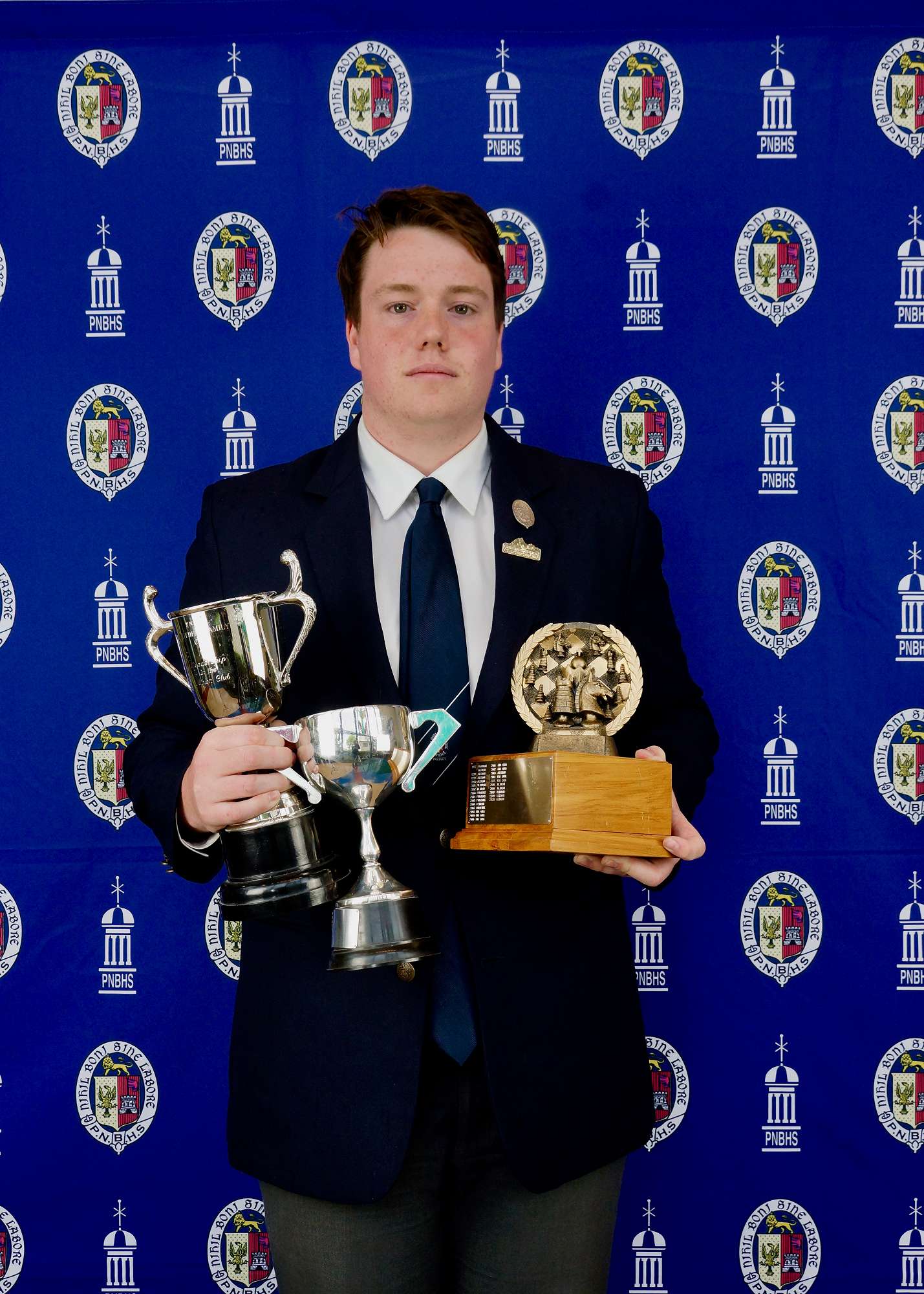 Albion - Club Captain Zac Tutty with the Sims Trophy for Chess, the Hallett & Fountain Cup for Shooting, the Whitehead Family Cup for Leadership in Albion Club — Image by: PNBHS