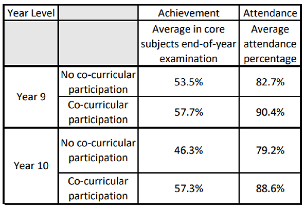 In the junior school (Year 9 and Year 10) we looked at the achievement, measured by the average mark in the end-of-year examinations across the core subjects (English, mathematics, science and social studies), and attendance of young men involved in co-curricular activities compared to those who are not involved. This data is shown in the table below: