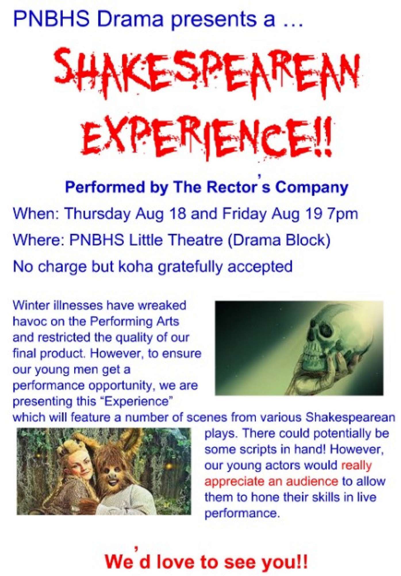Winter illnesses have wreaked havoc on the Performing Arts and restricted the quality of our final product. However, to ensure our young men get a performance opportunity, we are presenting this "Experience" which will feature a number of scenes from various Shakespearean plays. There could potentially be some scripts in hand! However, our young actors would really appreciate an audience to allow them to hone their skills in live performance.