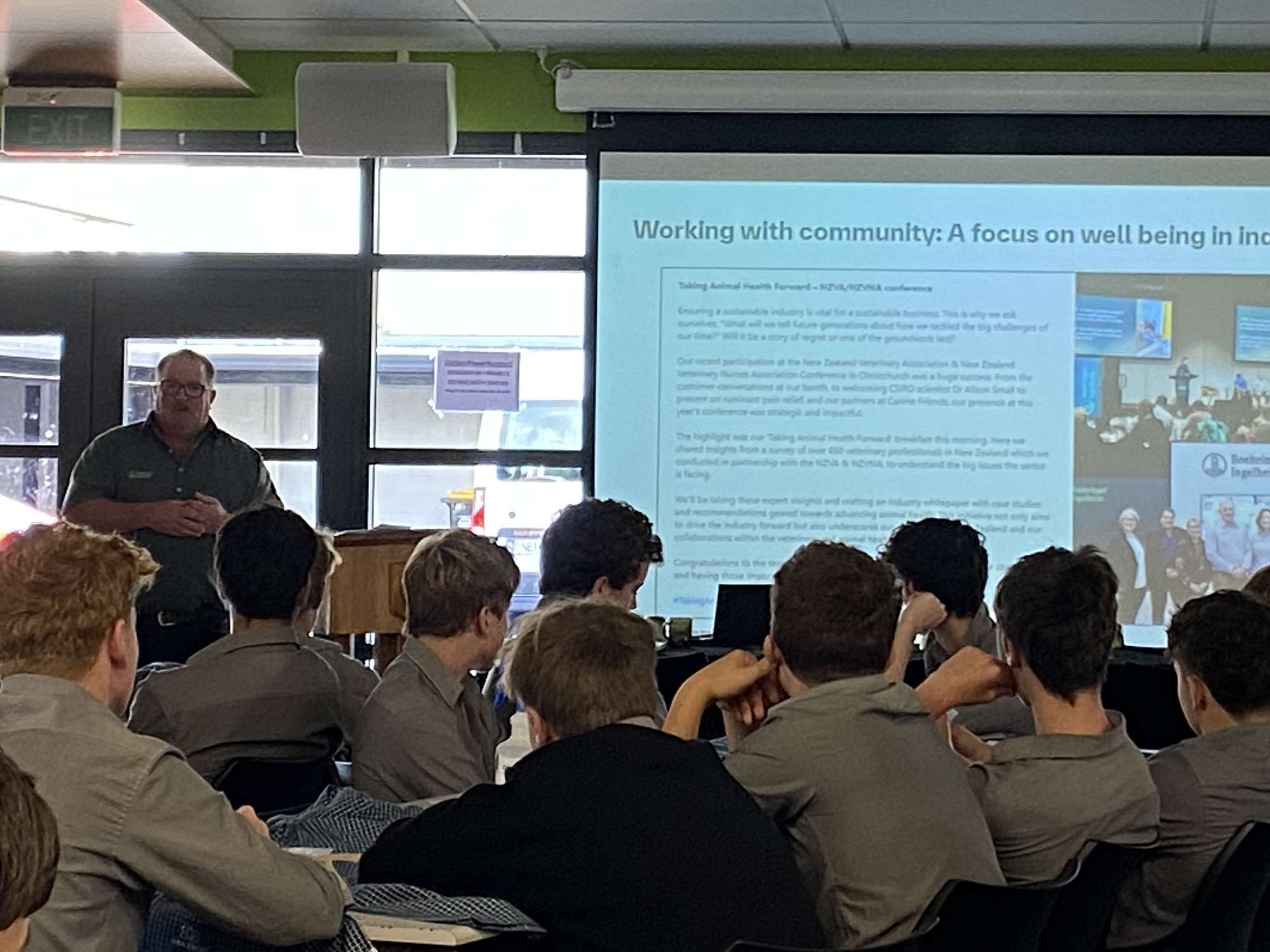 Each week 48 young men (11 Year 11 students, 30 Year 12 students and seven Year 13 students) spend time completing practical farming work under the guidance of tutors from PITO, the Primary Industries Training Organisation. Earlier this term these young men attended a presentation with Mr Dan Gardner, Key Account Manager for Boehringer Ingelheim, who provides animal healthcare products for the New Zealand agriculture sector. Mr Gardner emphasised the very wide range of opportunities available in agriculture and encouraged the young men to consider their future pathways with their eyes open to all of the possibilities.