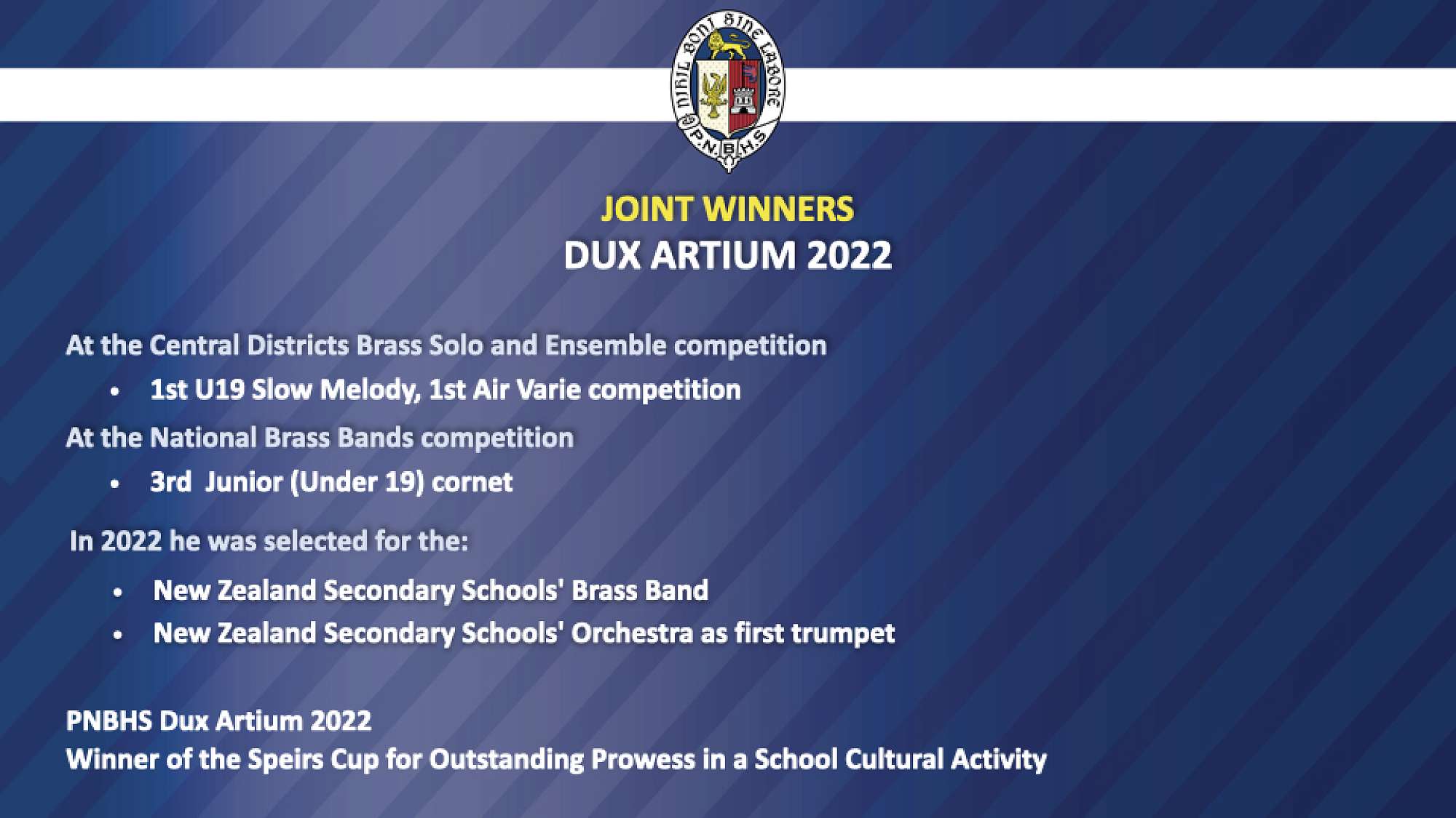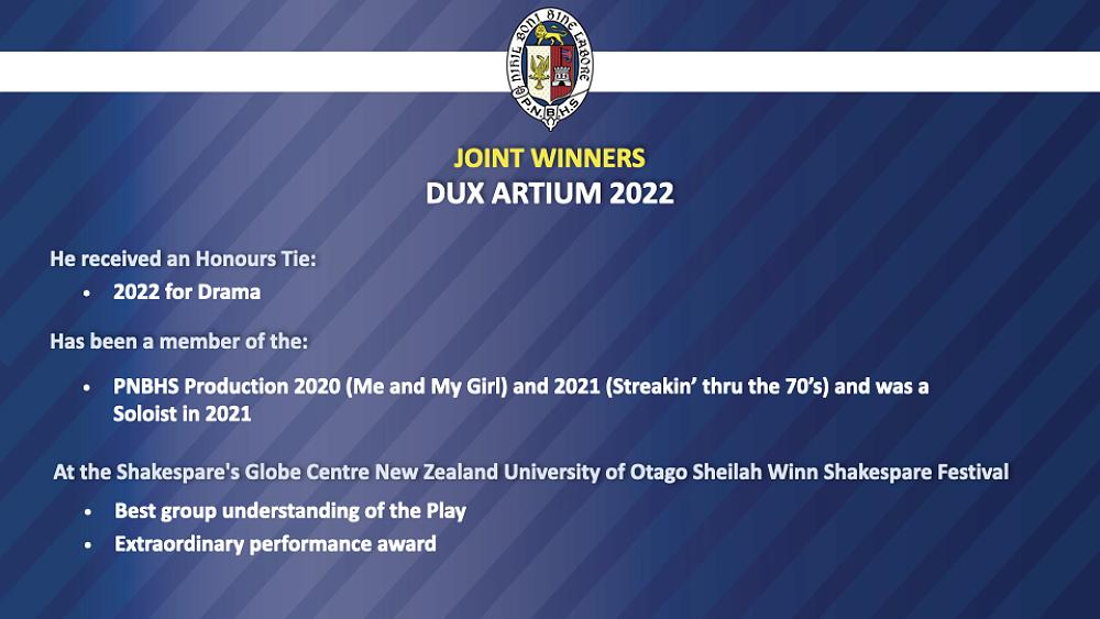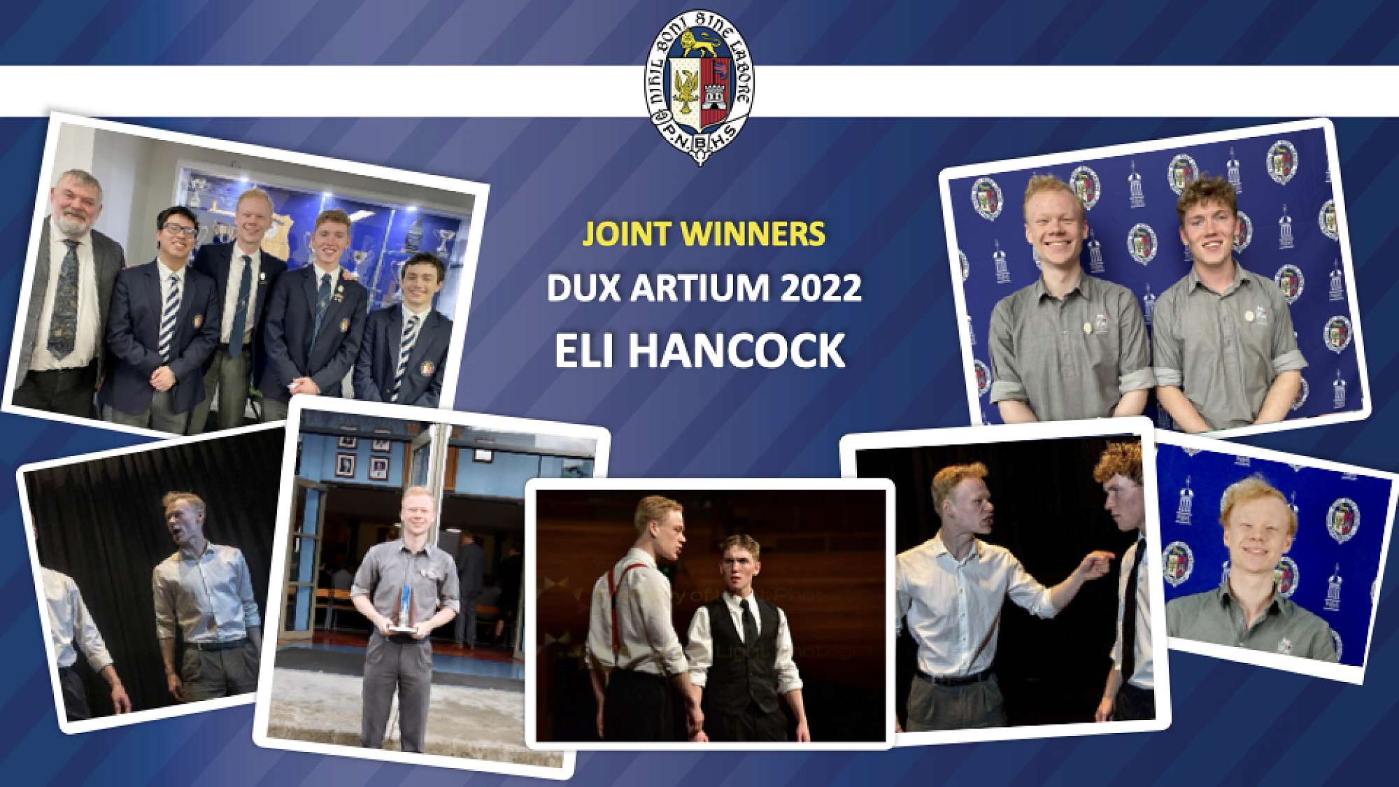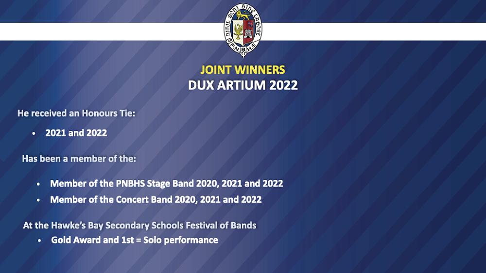 In 2022 the Dux Artium award was won jointly by Eli Hancock and Arahan Pilkington. Congratulations to both of these young men who have shown incredible dedication and determination in their chosen fields.