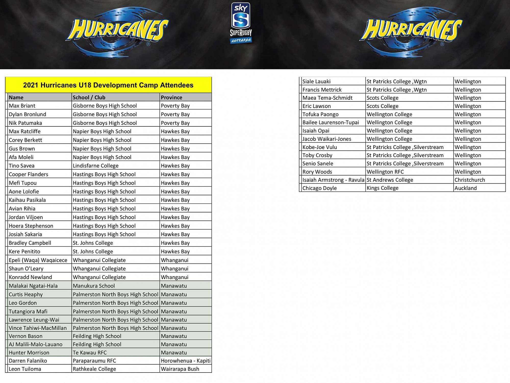 Hurricanes U18 Selections 2021