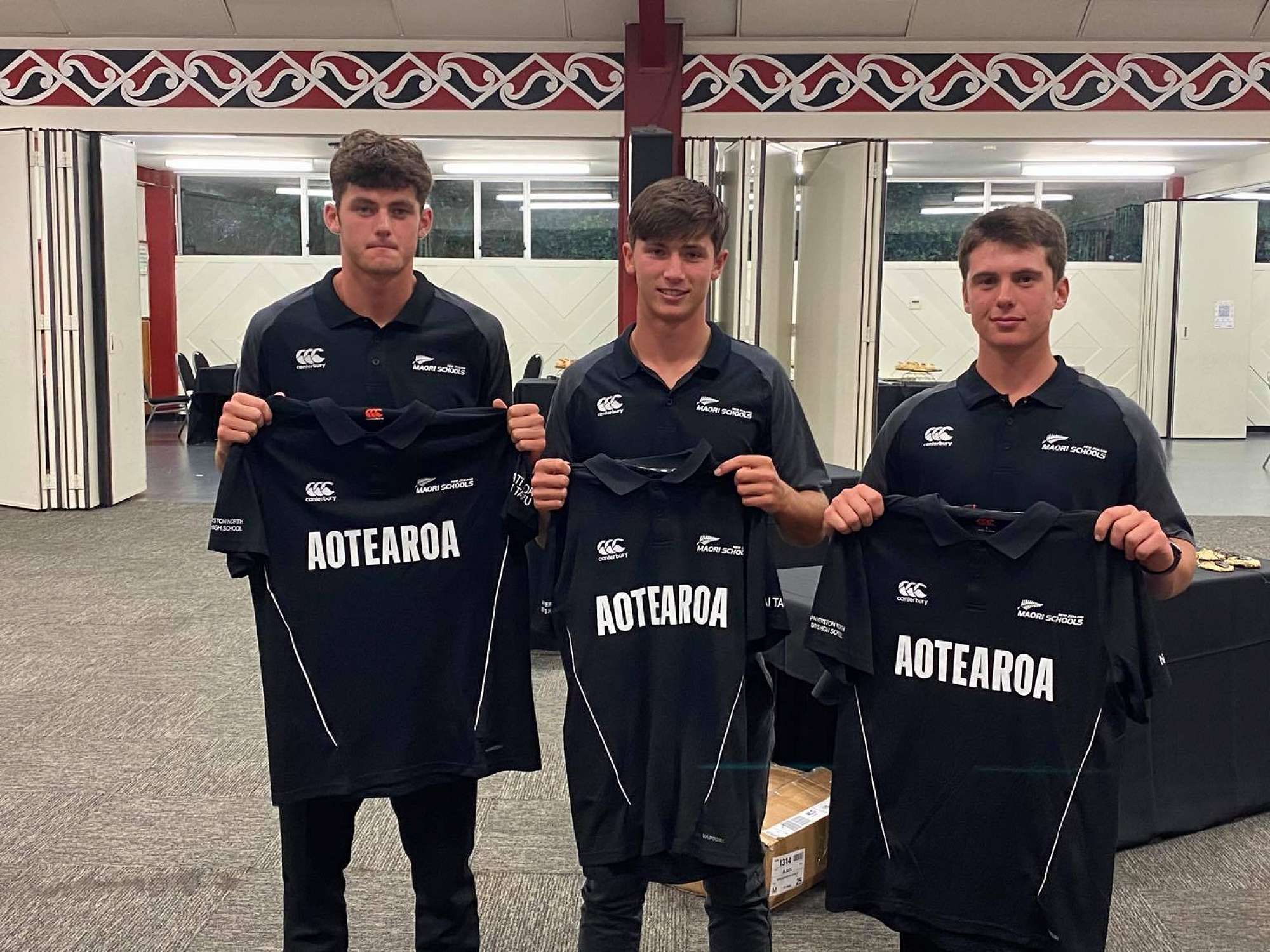 NZ Secondary Schools’ Māori Cricket team - Angus Lyver, Curtis Heaphy (captain) and Bayley Latter