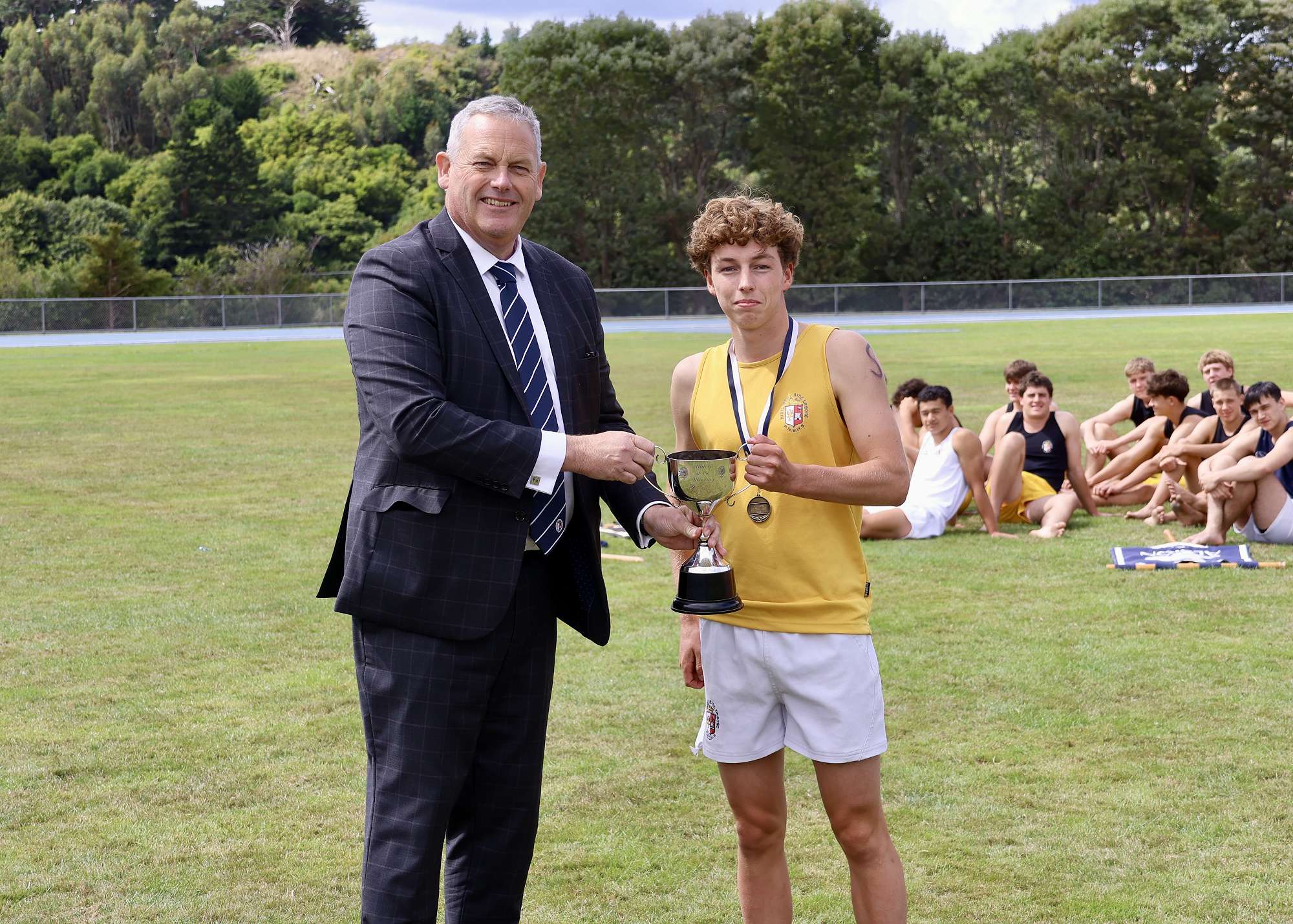 Congratulations to Jacob Lean who was named Athlete of the Meet at the annual PNBHS Athletics Championships and was presented with the trophy and medal. The Athlete of the Meet title is determined by points on an international ranking system which are awarded for performances in individual events. For the first time ever, this award was a three-way tie and needed to be determined by considering the athletes' performances in the other events they contested. Jacob was also presented with the Rector’s Cup, which is awarded to the young man who has earned the most points for their club at the PNBHS Athletics Championships. Jacob was first in the Open 10,000m, first in the Senior 5,000m, first in the Senior 3,000m and first in the Senior 1,500m – an outstanding achievement.